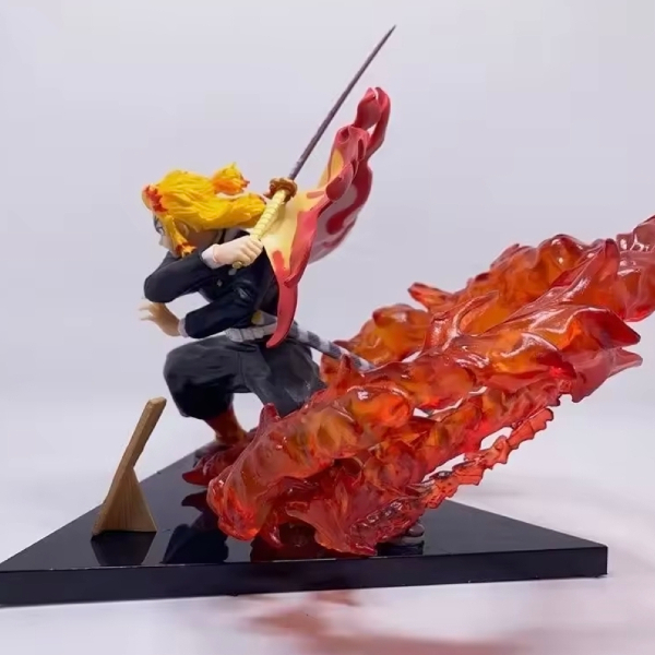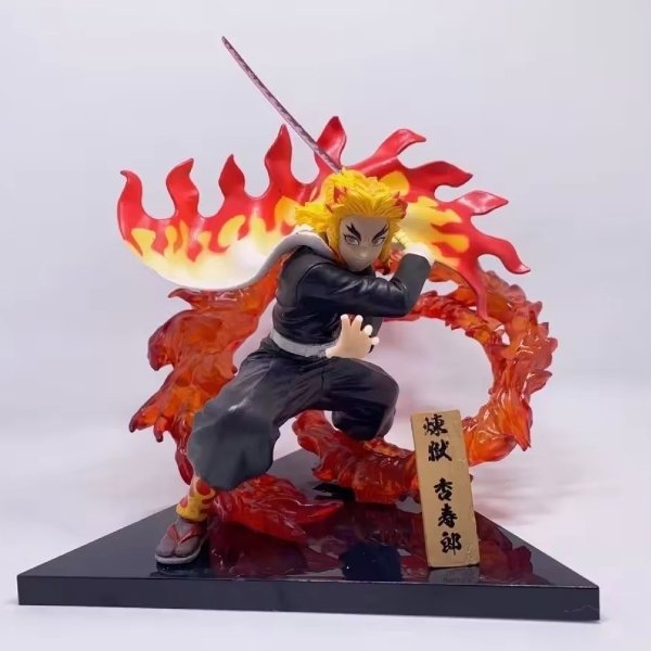 Bring the intensity of the Mugen Train arc to your shelf. This meticulously crafted figure showcases Rengoku unleashing his Flame Breathing technique, surrounded by a swirling vortex of translucent fire effects that catch the light from every angle.